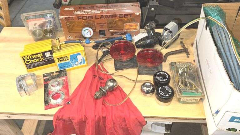 Trailer Accessories and Parts Set: Wheel Chocks, Fog Lamps, Wiring Kit, includes wheel bearing protectors, additional trailer wiring, trailer ball, suitable for general trailer use.