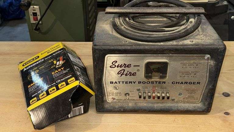 Sure-Fire Battery Booster Charger, 200 Amps Boost, 6-12V Compatibility, automatic charger and maintainer, UL listed, suitable for 12V batteries, includes battery clips.