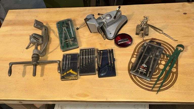 Alvin & Morille Drafting Compass Sets, Precision Tool Set, includes two compass sets, bench vise, ball joint mount, precision screwdriver sets, circular decorative item, metal and plastic, West Germany.
