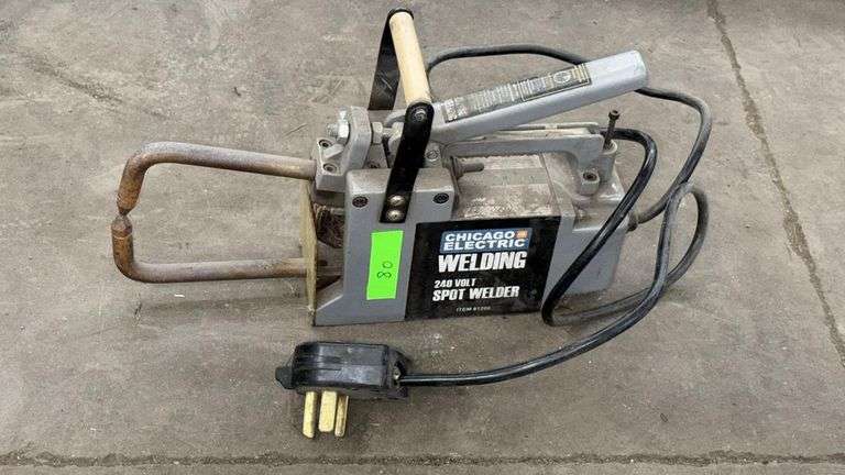 Chicago Electric 61206 Spot Welder, 240V, 6,500 Amps Output, 1.5 kVA Power Consumption, 30 lbs (13.6 kg), Dimensions: 16.5x7.5x10 inches (42x19x25 cm), Duty Cycle: 20% at full load, Cable Length: 6 feet (1.8 meters), 0.1 inch (2.5 mm) steel thickness welding capacity, 3-prong plug.