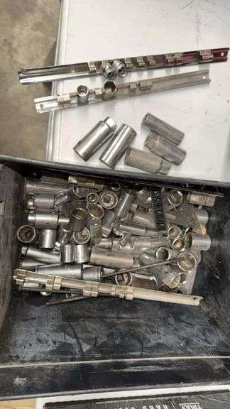 Socket Set, Multiple Assorted Pieces, Chrome Vanadium Steel, Includes two socket rails, Various sizes typically from 4mm to 32mm, Common drive sizes 1/4", 3/8", 1/2", Chrome or polished finish.