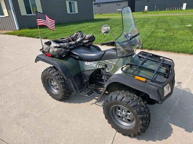 3 | 2003 Arctic Cat 300 ATV, 300cc, Green, VIN 4UF03ATV13T209831 The Arctic Cat 300 ATV features a 300cc single-cylinder, 4-stroke engine, automatic CVT transmission, selectable 2WD/4WD drive system, fully independent suspension, with a mileage of 895 miles, windshield, camo seat cover, flag. The Arctic Cat 300 ATV features a 300cc single-cylinder, 4-stroke engine, automatic CVT transmission, selectable 2WD/4WD drive system, fully independent suspension, with a mileage of 895 miles, gasoline, windshield, camo seat cover, flag. | Completed | $1,600.00 | Bidding complete | |