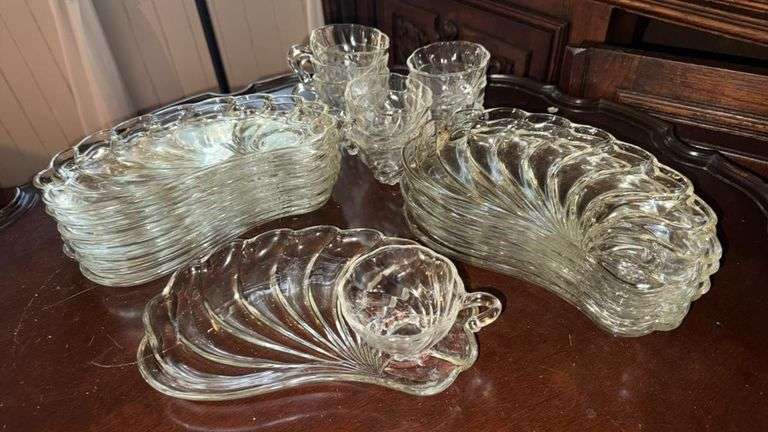 Shell-Shaped Glass Snack Trays with Cups Set, Mid-20th Century