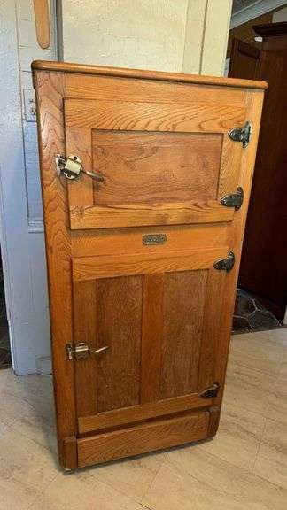 24 | Antique Oak Ice Box, Early 20th Century, Metal Lined Interior Antique Oak Ice Box, dimensions 25x18x51 inches (63.5x45.7x129.5 cm), approximately 100 lbs (45.4 kg), brass hinges and latches, freestanding, represents early refrigeration technology before electric refrigerators. | Completed | 1****5 54 bids | $92.50 | Bidding complete | ||