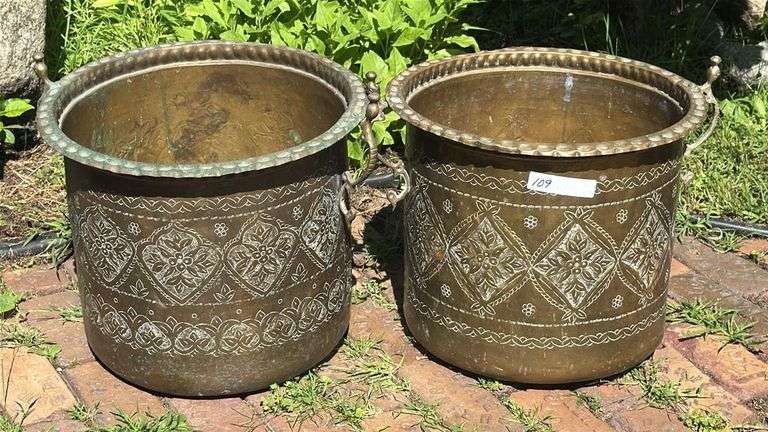 Set of Two Brass Planters, 17x15 in, Engraved Floral Pattern