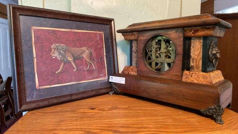 Antique Mantel Clock with Lion Accents, Wood & Metal with Lion Picture