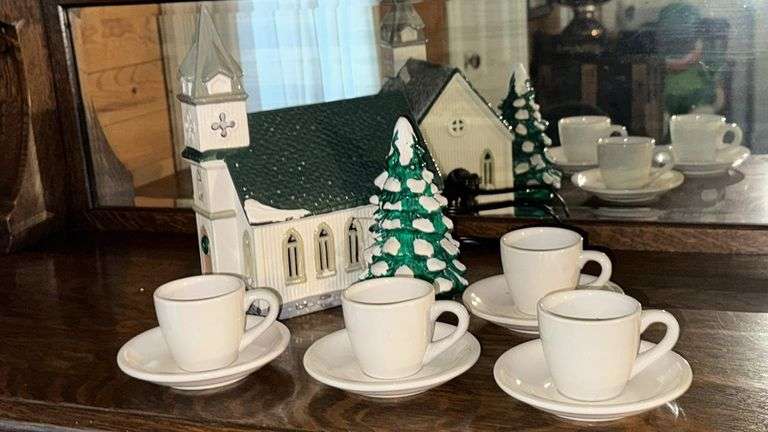 Porcelain Church Lamp Figurine with 4 Espresso Cups & Saucers Set