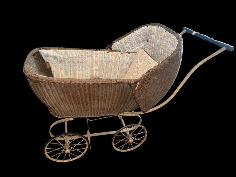 Vintage Wicker Baby Pram with Adjustable Hood, Floral Interior