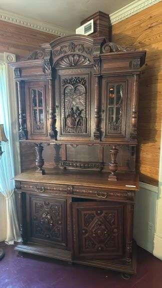 Antique Victorian Hutch Sideboard Cabinet with Intricate Carvings, 95"x54"x21"